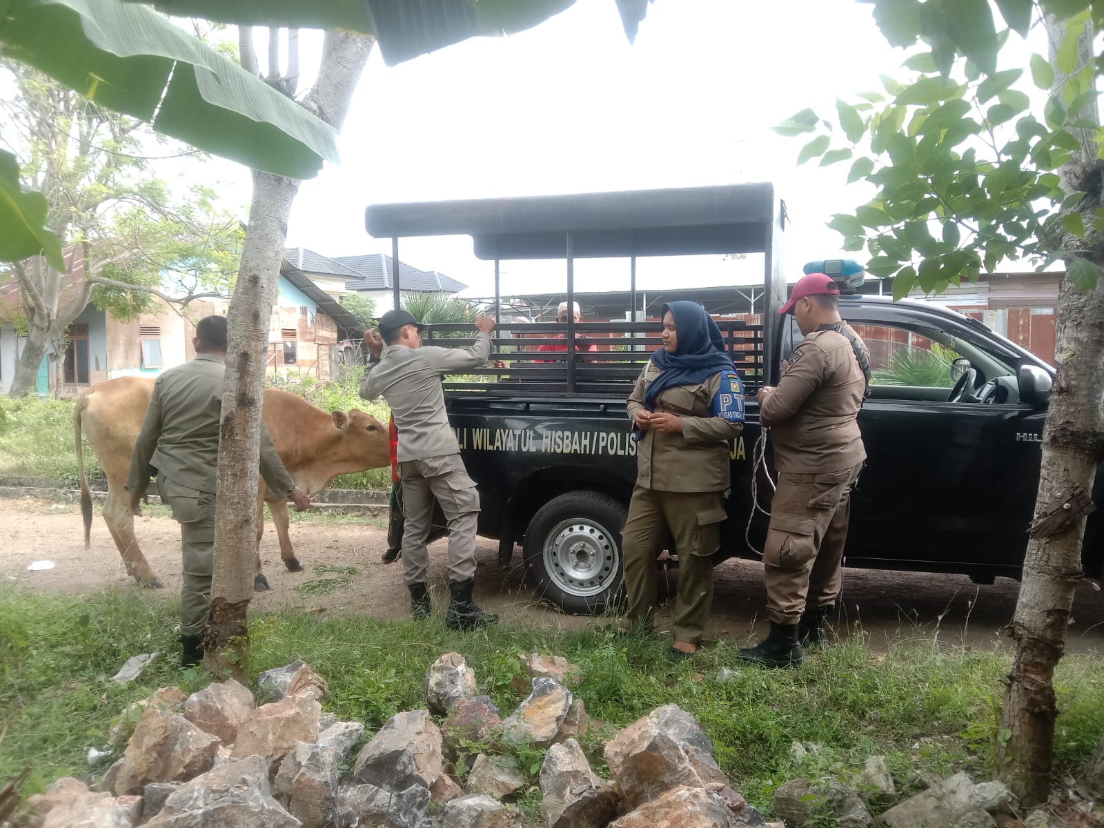 Jantho. RU ā Satuan Polisi Pamong Praja dan Wilayatul Hisbah (Satpol PP & WH) Kabupaten Aceh Besar kembali mengamankan dua ekor sapi yang berkeliaran dan berpotensi membahayakan pengguna jalan serta mengganggu ketertiban umum, di sepanjang jalan lintas Gampong Bayu, Kecamatan Darul Imarah, Kabupaten Aceh Besar, Jumat (23/05/2025) pagi.