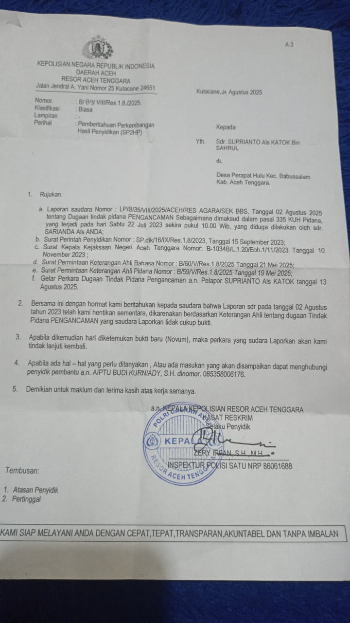 Dalam surat itu disebutkan bahwa laporannya dihentikan sementara karena tidak cukup bukti atas dugaan tindak pidana pengancaman. Penyidik menyatakan perkara dapat dibuka kembali apabila ditemukan bukti baru (novum).