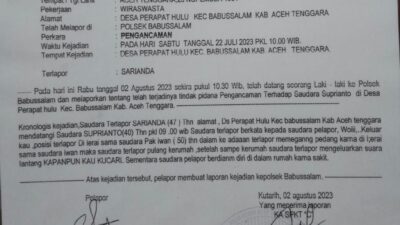 Laporan tersebut teregister dengan nomor LP/B/35/VIII/2023/Aceh/RESAGARA/SEK di Polsek Babussalamm.