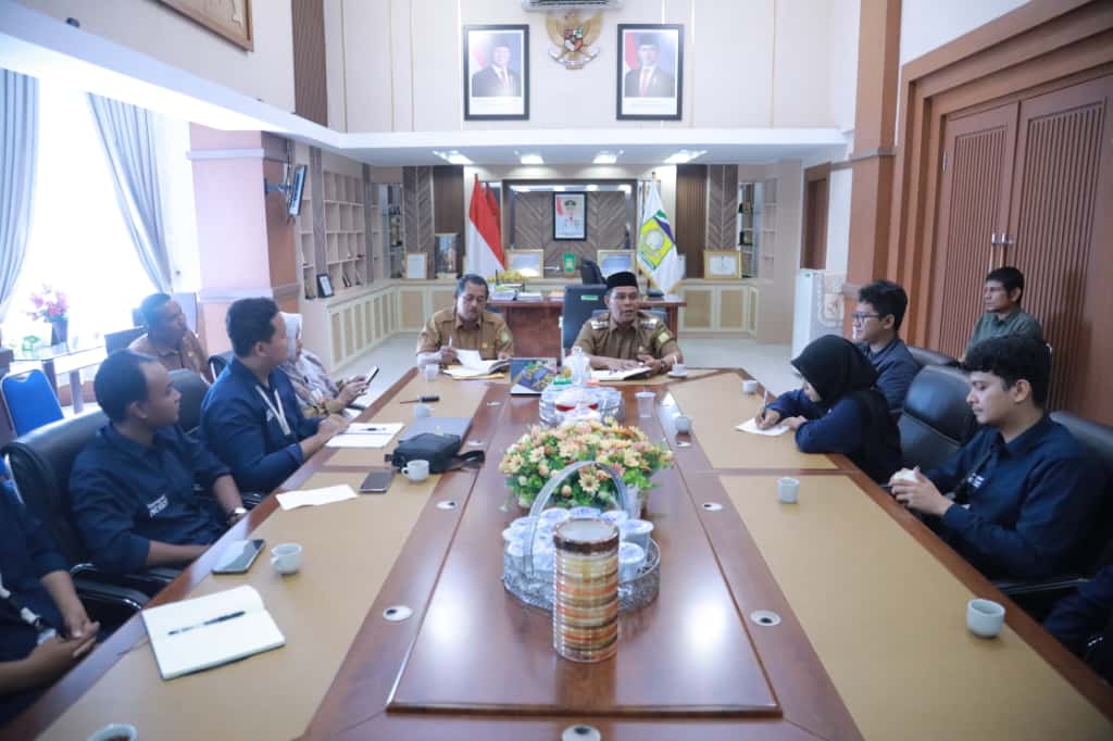 Jantho. RU – Bupati Aceh Besar Muharram Idris (Syech Muharram) menerima audiensi Tim Patriot Kajian Pengembangan Kawasan Transmigrasi (KPKT) dari UGM dan ITS di ruang kerja Bupati Aceh Besar, Kota Jantho, Selasa (23/09/2025).