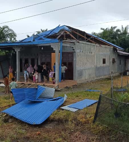 Aceh Singkil. RU – Rumah Arsyad Warga Singkil Utara mengalami kerusakan parah karena atapnya yang berwarna biru beterbangan akibat diterjang angin puting beliung, pada Minggu (28/09/2025).