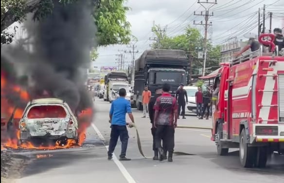 Kobaran api dengan cepat membesar hingga melahap seluruh bodi mobil.