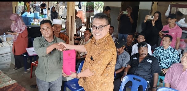 Datok Penghulu Kampung Mekar Jaya, Sofyan Effendi tampak terharu saat menerima sertifikat hibah dari tangan Azhari.
