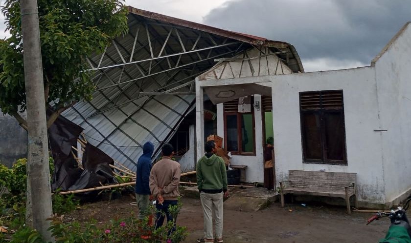 Pusdalops BPBD menyebut dua bangunan mengalami kerusakan berat, sementara satu lainnya rusak ringan setelah tertimpa material atap terbawa angin.