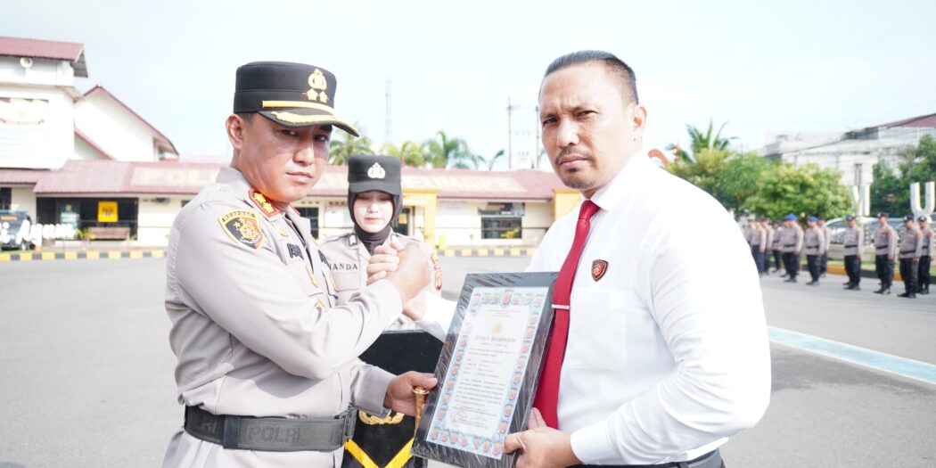 Lhokseumawe. RU – Kapolres Lhokseumawe AKBP Dr. Ahzan, S.H., memimpin upacara pemberian penghargaan kepada personel Sat Reskrim dan Sat Narkoba berprestasi di halaman Satya Haprabu Polres setempat, Senin (03/11/2025).