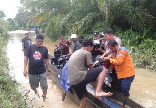 Pengendara sepeda motor menyeberang menggunakan perahu milik warga, sementara mobil berhenti di tepi jalan menunggu air surut.