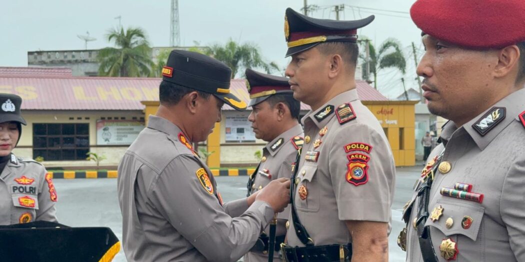Lhokseumawe. RU – Kapolres Lhokseumawe AKBP Dr. Ahzan, M.S.M. memimpin upacara serah terima jabatan (sertijab) Kasat Intelkam, Kasat Reskrim, dan Kapolsek Muara Batu di Aula Wira Satya Mapolres setempat, Kamis (13/11/2025).