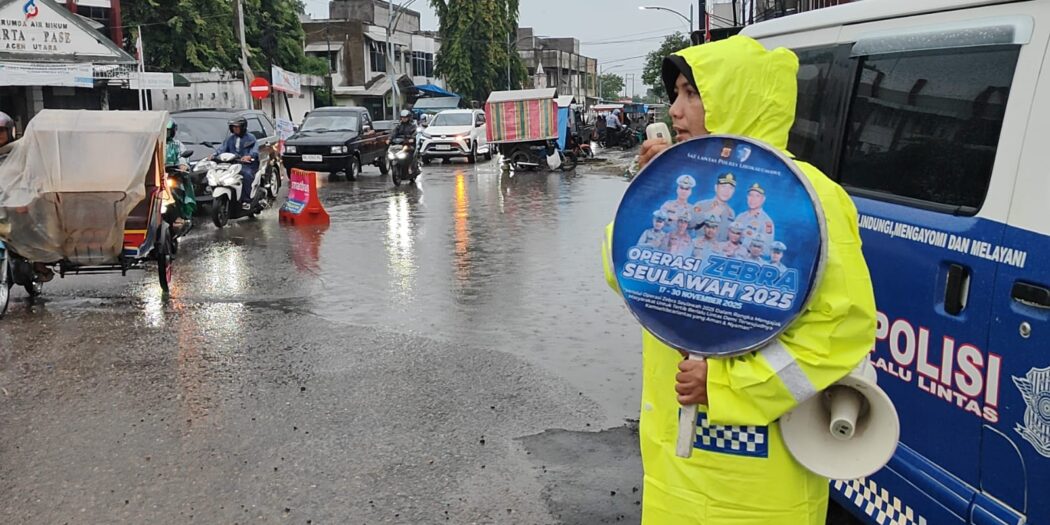 Lhokseumawe. RU – Hujan yang mengguyur Kota Lhokseumawe tidak menghalangi Satgas I Preemtif Satlantas Polres Lhokseumawe melaksanakan penyuluhan keliling dalam rangka Operasi Zebra Seulawah 2025, Sabtu (22/11/2025).