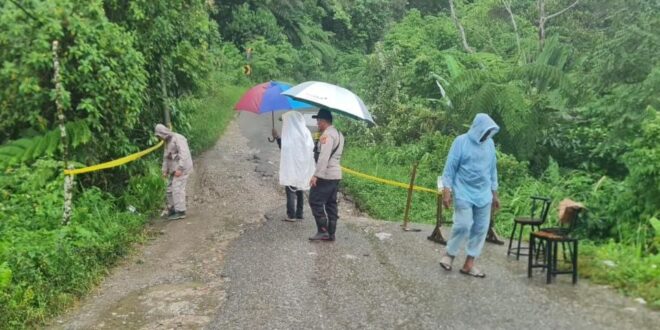 Lhokseumawe. RU – Polres Lhokseumawe memasang police line dan tanda bahaya pada kawasan rawan longsor di Gunung Salak, Aceh Utara, Selasa (25/11/2025).