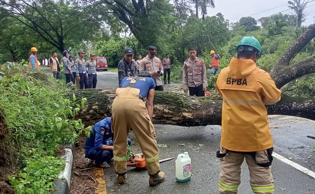 Batang pohon melintang di badan jalan dan hampir menutup seluruh akses, sehingga arus lalu lintas sempat terhambat.