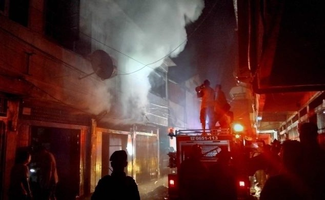 Banda Aceh. RU – Sebuah ruko dua lantai yang dijadikan gudang aksesoris jok mobil di kawasan Pasar Kartini, Peunayong, Kuta Alam, Banda Aceh, hangus dilalap api, pada Rabu (26/11/2025) malam.