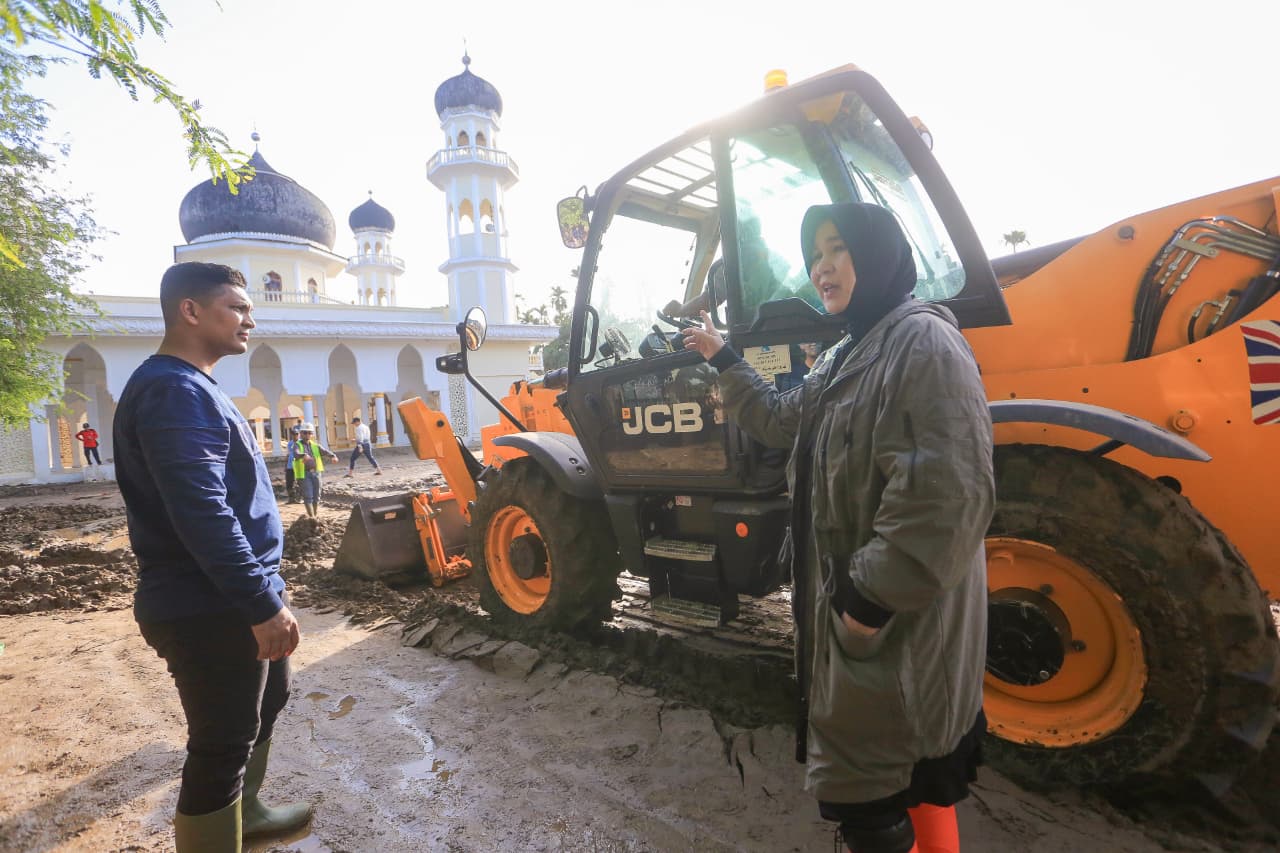 Bersama Wakil Wali Kota Afdhal Khalilullah dan pejabat pemko, ia ikut mengeruk lumpur yang mengeras di halaman masjid.