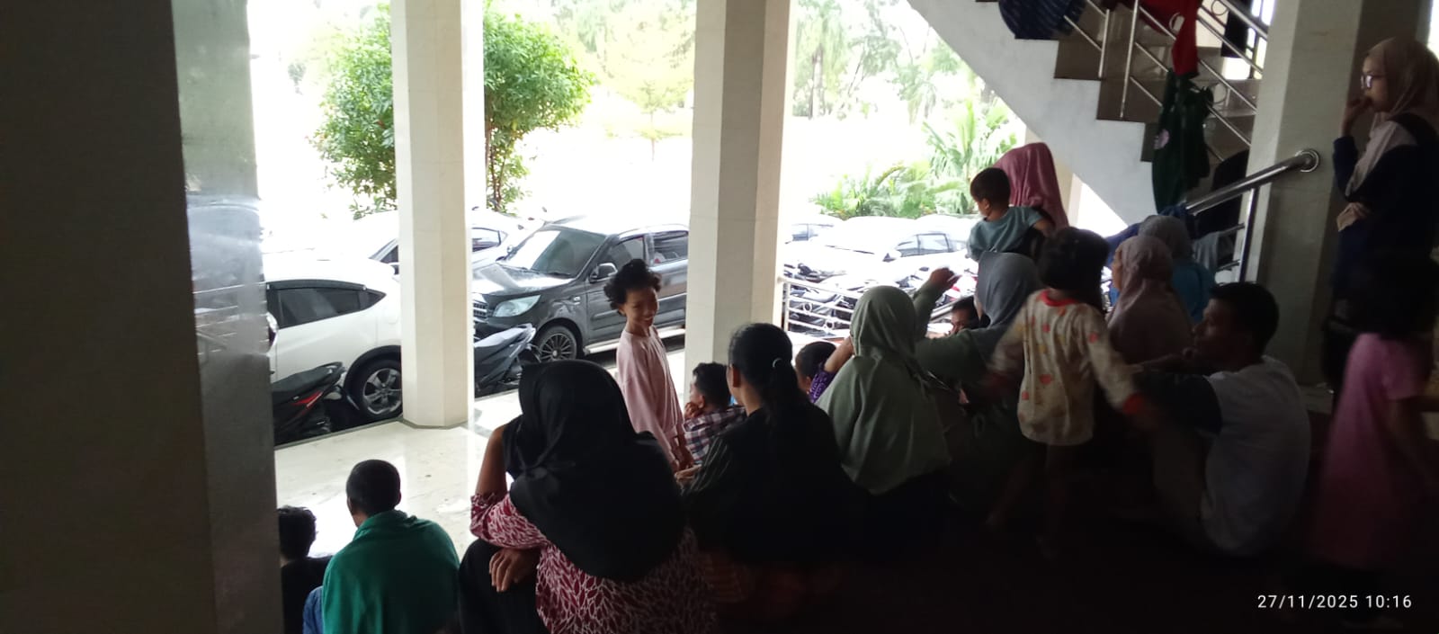 Air hujan yang ditampung menggunakan gelas plastik menjadi satu-satunya sumber minum, sementara tangis lapar balita terus terdengar sepanjang malam.