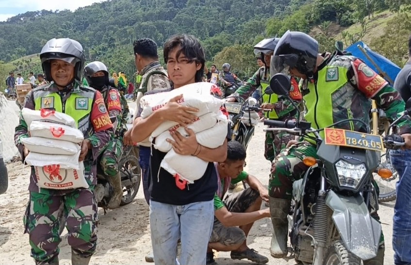 Sebanyak 90 personel TNI, didukung sekitar 30 warga, berjalan kaki dua jam dari Desa Simpur membawa satu ton beras, 25 dus mi instan, 15 papan telur, lima dus susu, dua dus sarden, sepuluh koli pakaian, serta kebutuhan pokok lainnya.