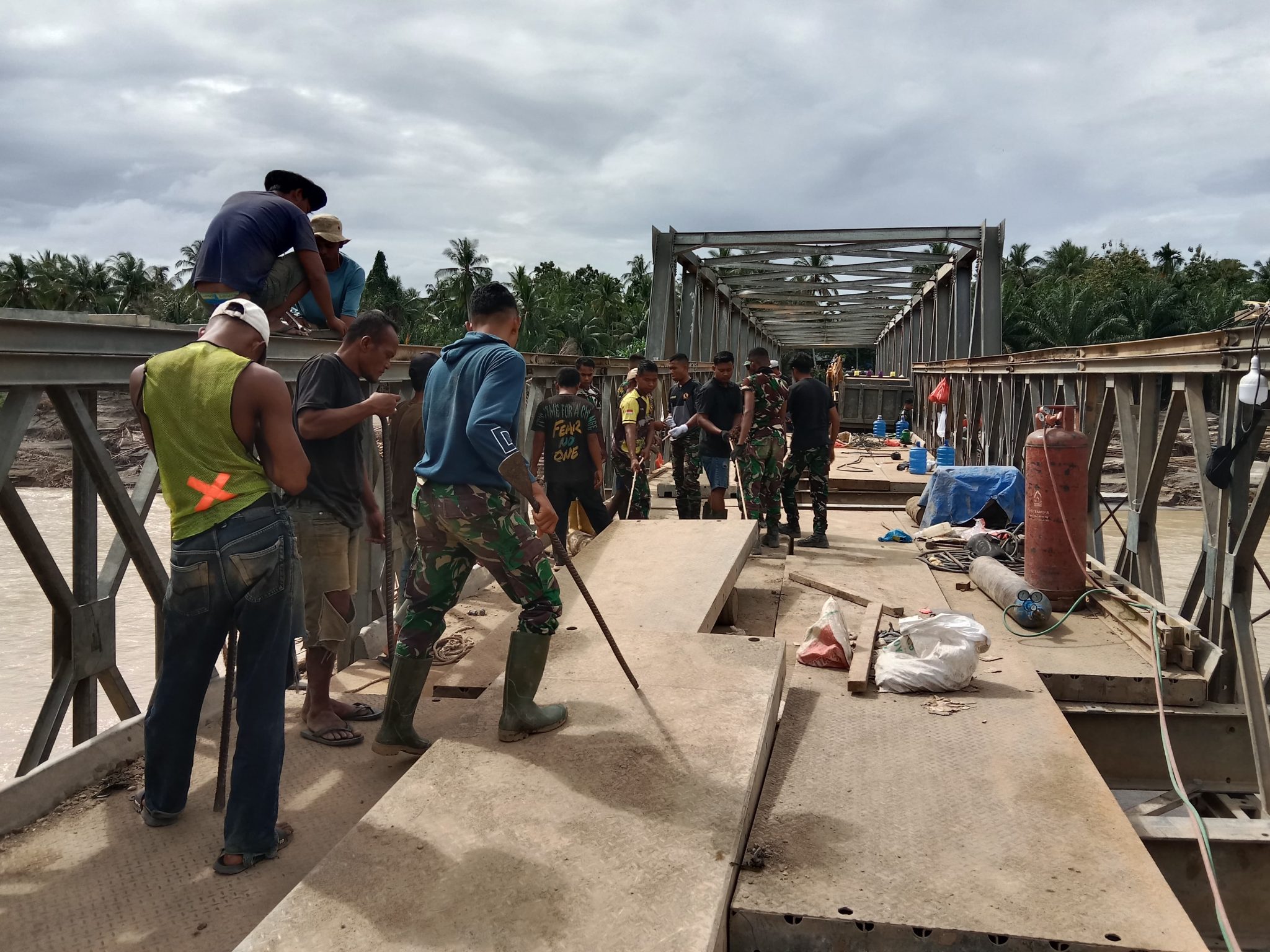 Jembatan dengan bentang sekitar 66 meter tersebut dikerjakan personel gabungan Zidam Iskandar Muda dan Yonzipur 16/Dhika Anoraga sebagai proyek prioritas untuk menunjang mobilitas serta distribusi logistik.
