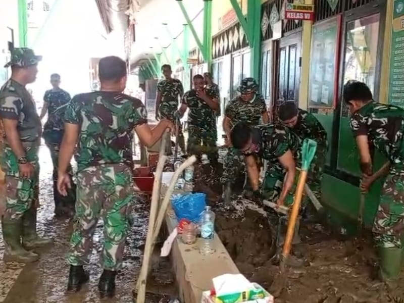 Kegiatan tersebut dipimpin Pasi Ops Kodim 0102/Pidie Kapten Inf Dian Susilo dengan melibatkan puluhan prajurit yang membersihkan lumpur, sisa kayu, serta sampah banjir di halaman dan ruang kelas.