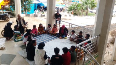 Kegiatan tersebut dilaksanakan di teras Gedung DPRK Aceh Tamiang yang menjadi salah satu lokasi pengungsian, dengan melibatkan relawan mahasiswa dan relawan perempuan untuk mendampingi anak-anak melalui edukasi serta permainan.