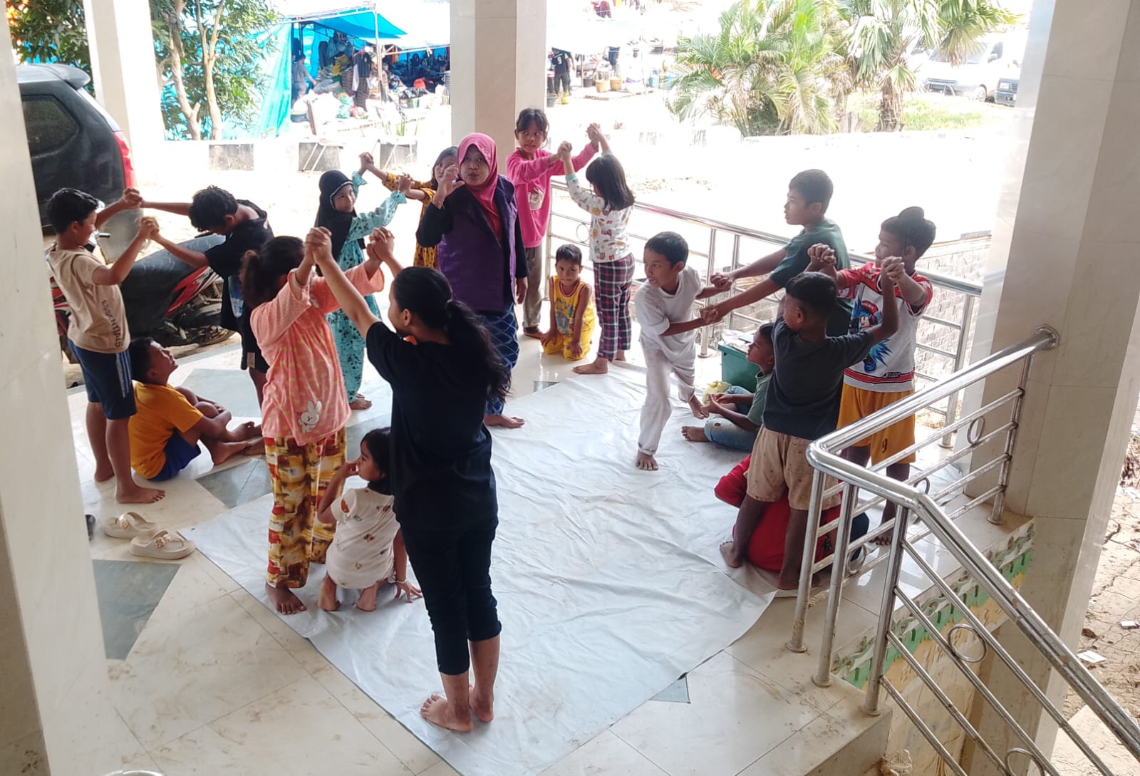 Sementara itu, relawan perempuan memberikan pendampingan psikososial guna memulihkan semangat serta mengurangi rasa takut anak-anak akibat pengalaman traumatis.