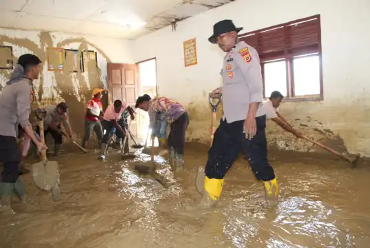 Personel Polres dan Polsek Woyla bergotong royong membersihkan lumpur serta material sisa banjir di ruang kelas dan lingkungan sekolah bersama perangkat gampong serta warga sekitar.