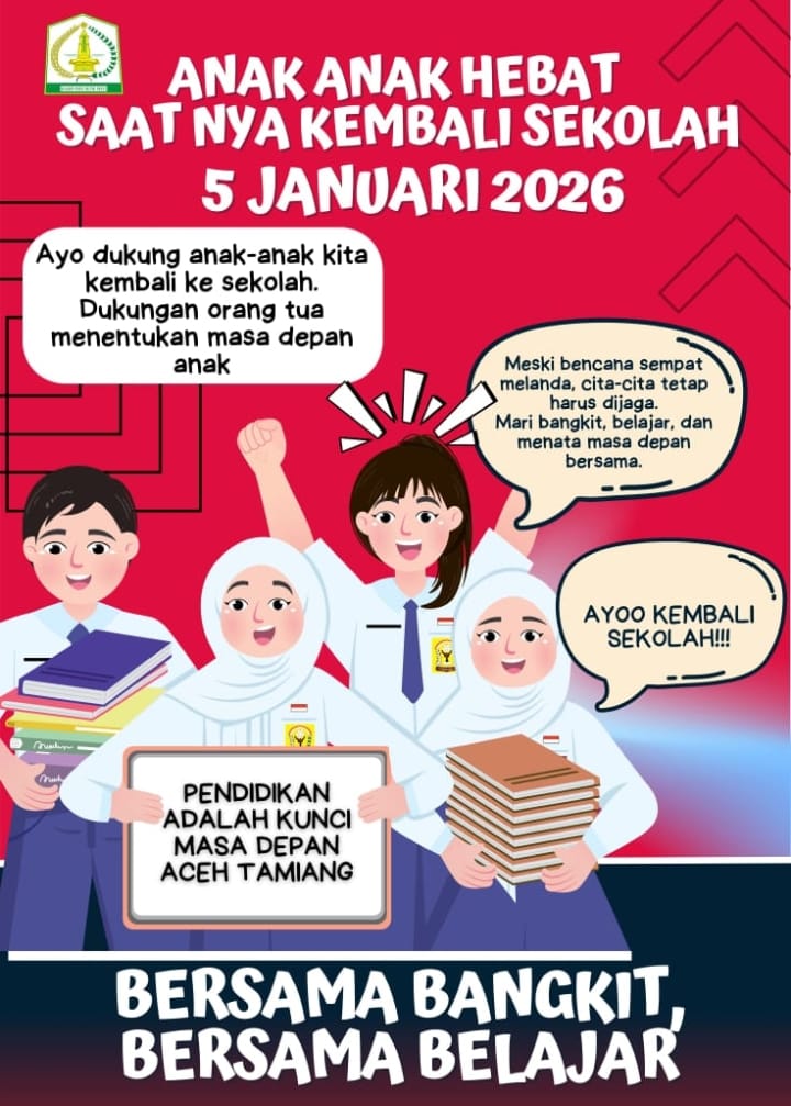 Kualasimpang. RU – Pemerintah Kabupaten Aceh Tamiang mengimbau seluruh wali murid semua jenjang pendidikan untuk kembali menyekolahkan anak-anak mulai Senin, 5 Januari 2026, setelah aktivitas belajar diliburkan akibat banjir hidrometeorologi.