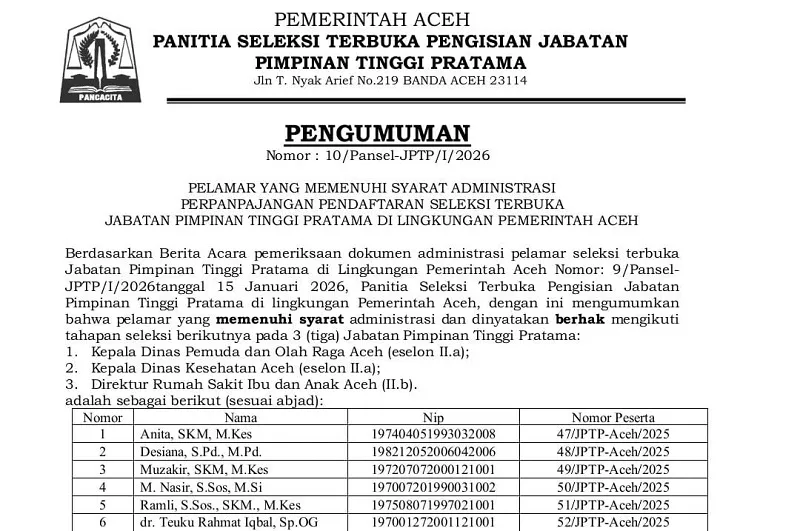 Seleksi terbuka ini ditujukan untuk mengisi tiga jabatan strategis, yakni Kepala Dinas Pemuda dan Olahraga Aceh, Kepala Dinas Kesehatan Aceh, serta Direktur Rumah Sakit Ibu dan Anak Aceh.