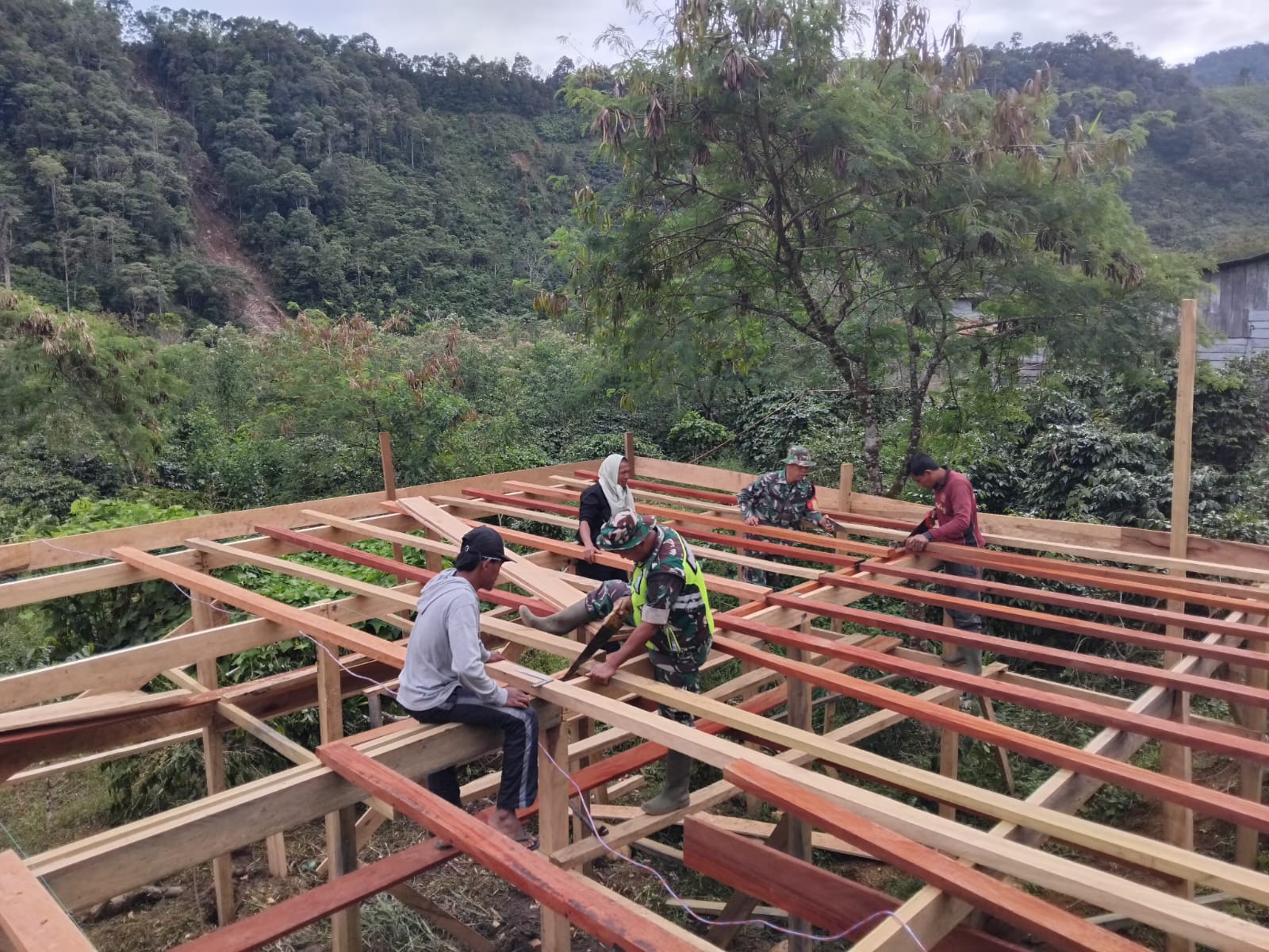Tampak anggota Koramil 04/Pintu Rime Gayo bersama masyarakat bergotong royong membangun mushola di Desa Uning Mas. Selasa 20 Januari 2026. [Foto Dok : rahasiaumum.com/*]