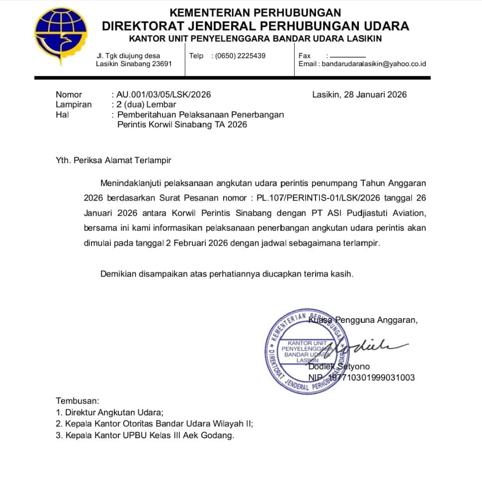 Berdasarkan surat tersebut, penerbangan perintis penumpang mulai beroperasi pada 2 Februari 2026 sesuai jadwal yang ditetapkan.