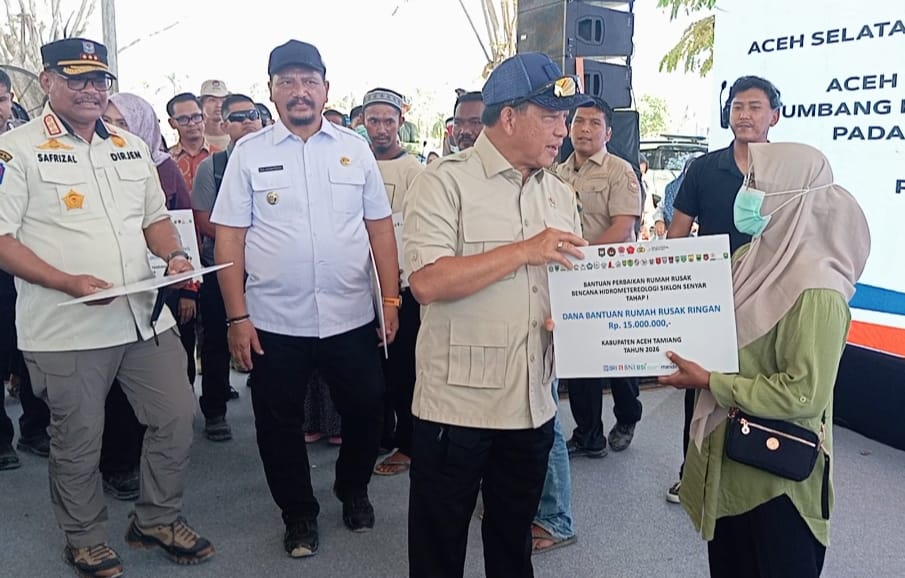 Kualasimpang. RU – Menteri Dalam Negeri Tito Karnavian menyerahkan bantuan stimulan perbaikan rumah bagi korban banjir di Kabupaten Aceh Tamiang tahap pertama.
