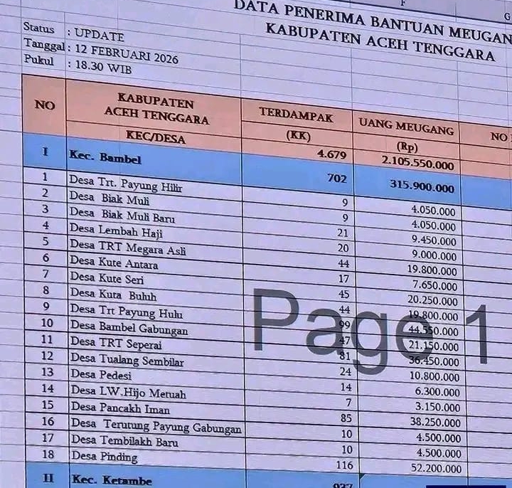 Data desa di Kecamatan Bambel Kabulaten Aceh Tenggara yang mendapat bantuan banjir. Minggu 15 Februari 2026. [Foto Dok : rahasiaumum.com/AFW016]