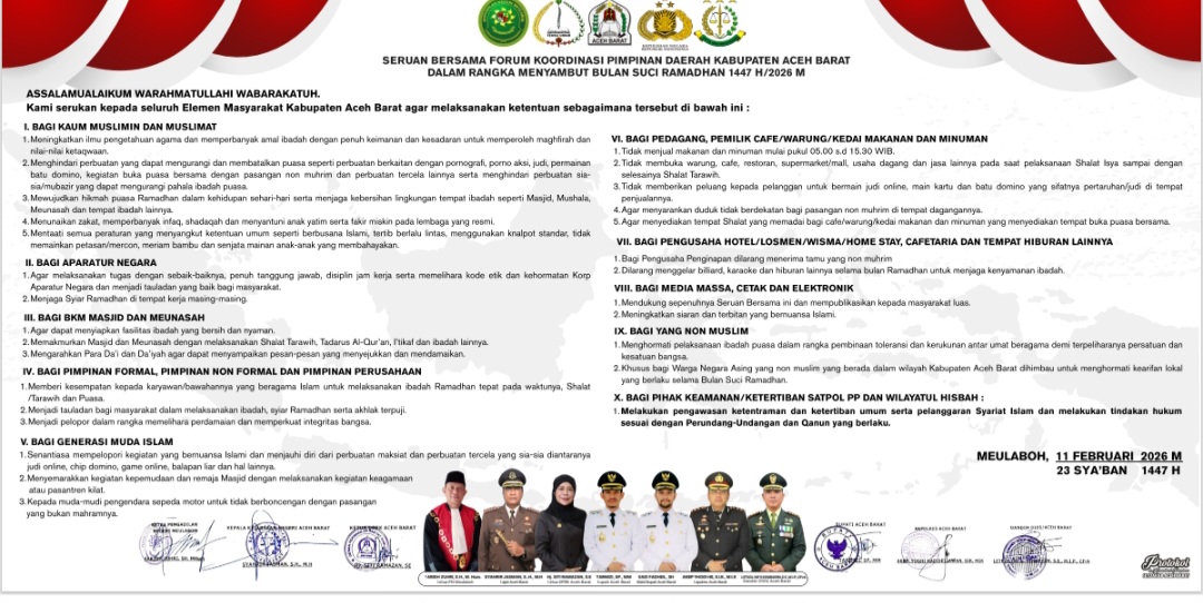 Aceh Barat. RU – Forum Komunikasi Pimpinan Daerah Kabupaten Aceh Barat mengeluarkan seruan bersama menyambut Ramadhan 1447 Hijriah.