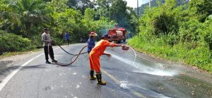 Kapolsek Trumon AKP Adrianus Telaumbanua menyampaikan pembersihan dilakukan menggunakan satu unit mobil pemadam kebakaran dengan metode penyiraman air bercampur deterjen guna menghilangkan sisa minyak di permukaan aspal.