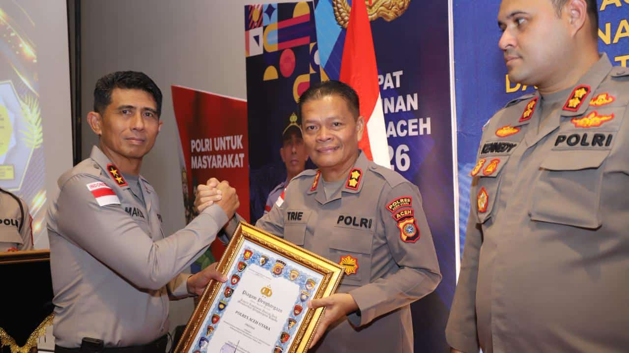 Penghargaan diserahkan langsung kepada Kapolres AKBP Trie Aprianto, dalam Rapat Pimpinan (Rapim) Polda Aceh 2026 di Hotel The Pade, Aceh Besar, pada Rabu (25/02/2026).