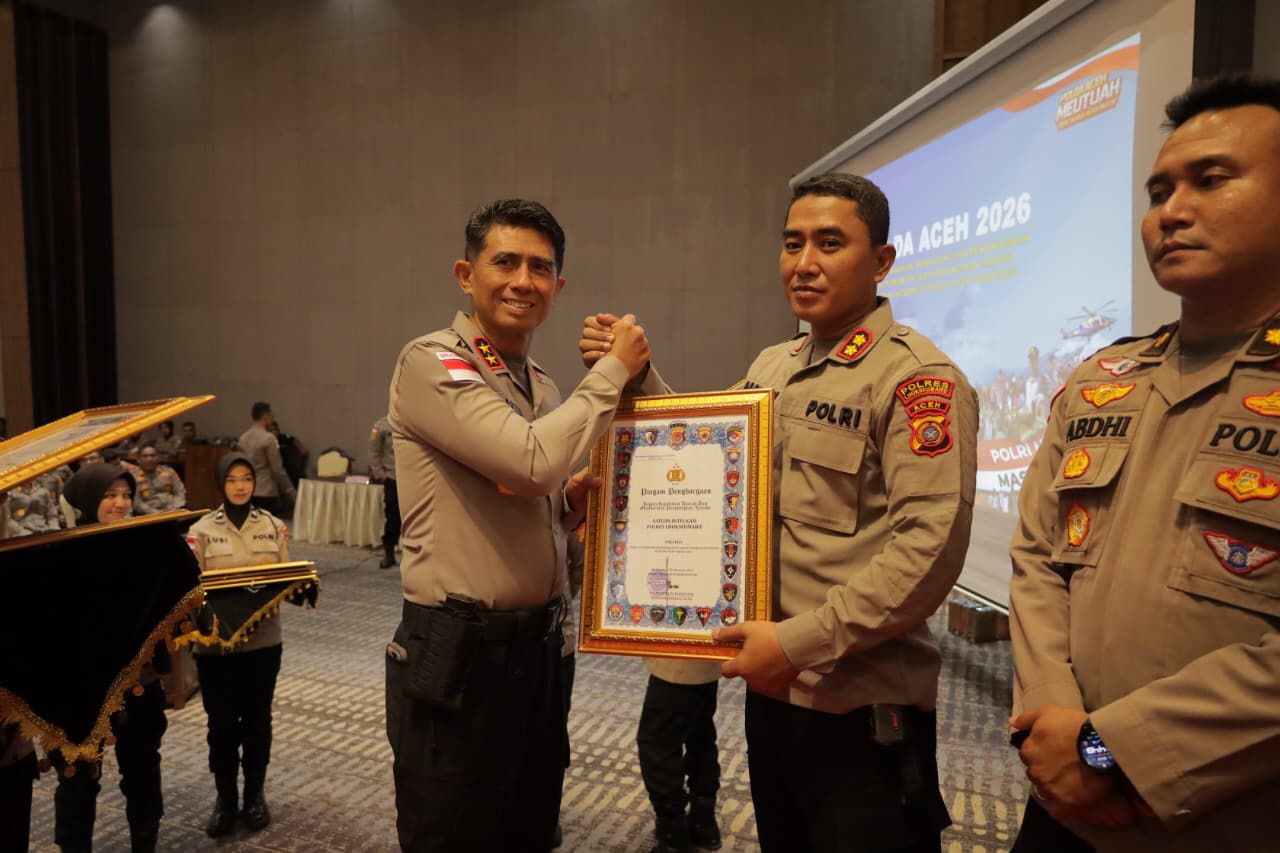 Penghargaan diserahkan oleh Kapolda Aceh, Marzuki Ali Basyah, kepada Kapolres Lhokseumawe AKBP Dr. Ahzan dalam Rapat Pimpinan (Rapim) Polda Aceh di Hotel The Pade, Aceh Besar, Rabu (25/02/2026).