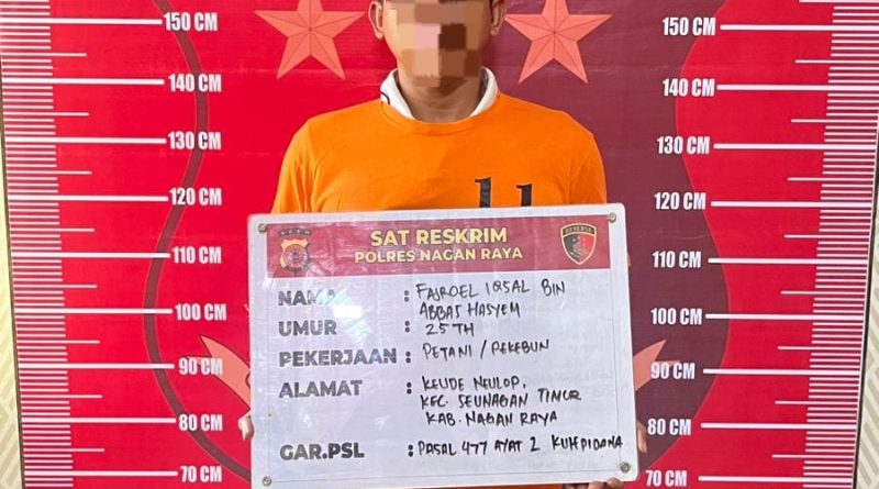Nagan Raya. RU – Satuan Reserse Kriminal Polres Nagan Raya menahan F.I. (24), warga Kecamatan Tadu Raya, terkait dugaan pencurian buah kelapa sawit di perkebunan PT Fajar Baizuri, Desa Alue Bata, Sabtu, 28 Februari 2026.