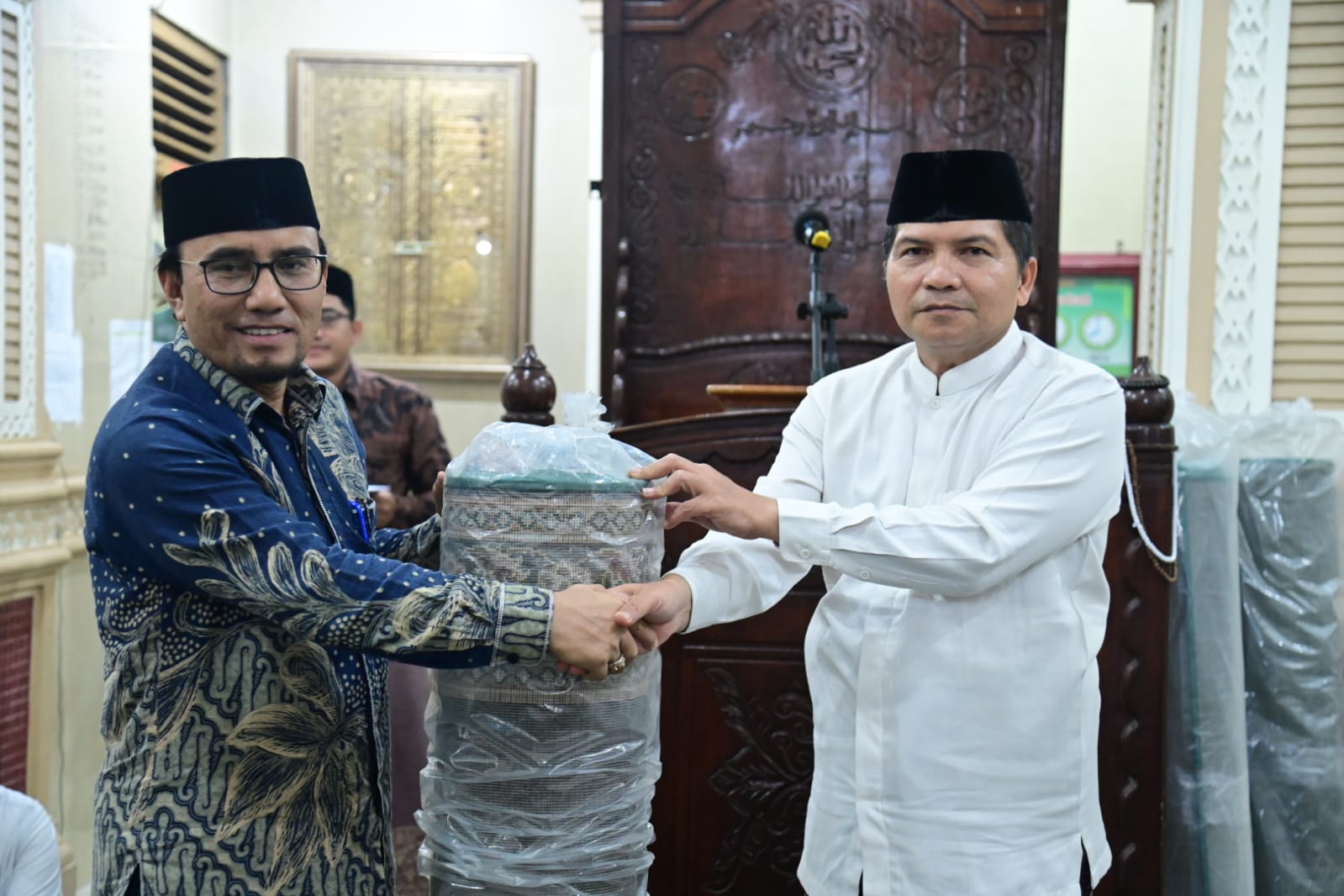 Aceh Besar. RU – Imam Masjid Baitul Makmur Sibreh Tgk H Faisal Ali menerima bantuan lima lembar ambal sajadah dari Tim Safari Ramadhan Pemerintah Aceh yang dipimpin Pelaksana Tugas Kepala Dinas Syariat Islam Aceh Marzuki, S.Ag., M.H., Rabu (04/03/2026).