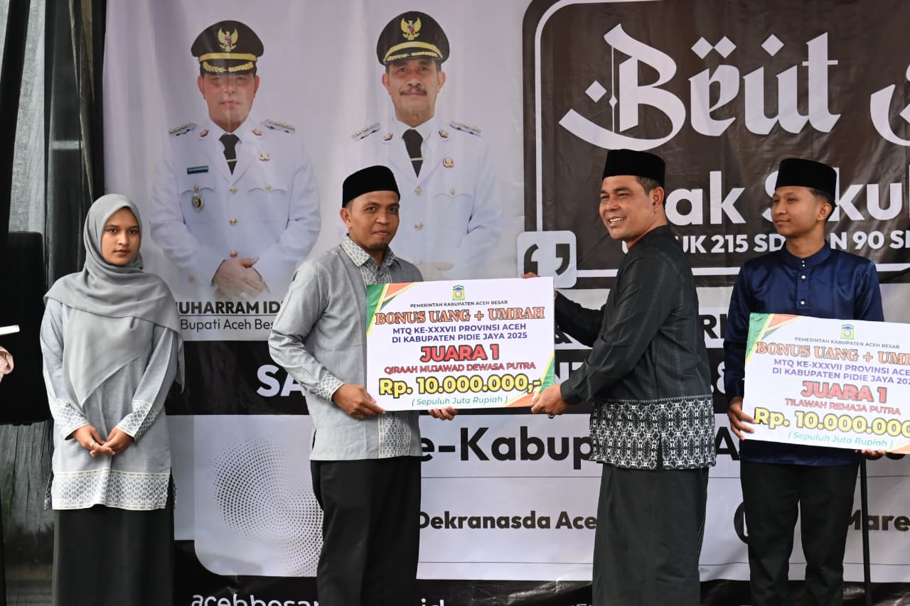 Aceh Besar. RU – Bupati Aceh Besar, Muharram Idris menyerahkan bonus uang dan hadiah umrah kepada putra-putri daerah yang meraih prestasi pada Musabaqah Tilawatil Quran (MTQ) Aceh 2025 di Pidie Jaya.