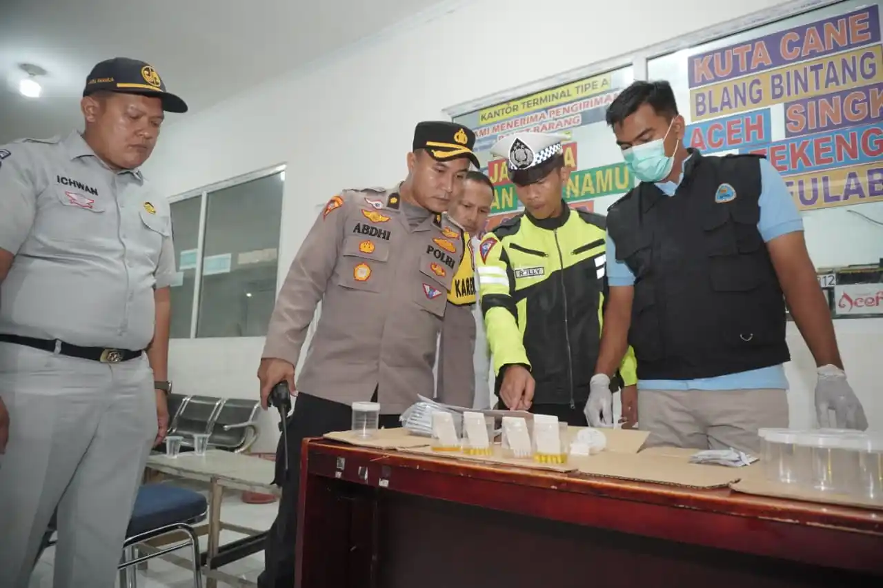 Lhokseumawe. RU – Polres Lhokseumawe melaksanakan pemeriksaan kelayakan kendaraan (ramcek) dan tes urine bagi sopir angkutan umum di Terminal A Kandang, Kecamatan Muara Dua, Rabu (18/03/2026).