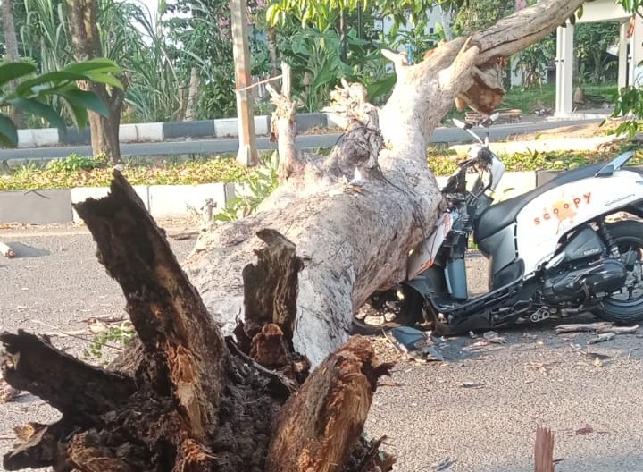 Tampak pohon tumbang di Jalan Bandara Sultan Iskandar Muda, Gampong Gani, Kecamatan Ingin Jaya, Aceh Besar, yang menimpa sepeda motor. Minggu 22 Maret 2026. [Foto Dok : BPBD Aceh Besar/rahasiaumum.com]