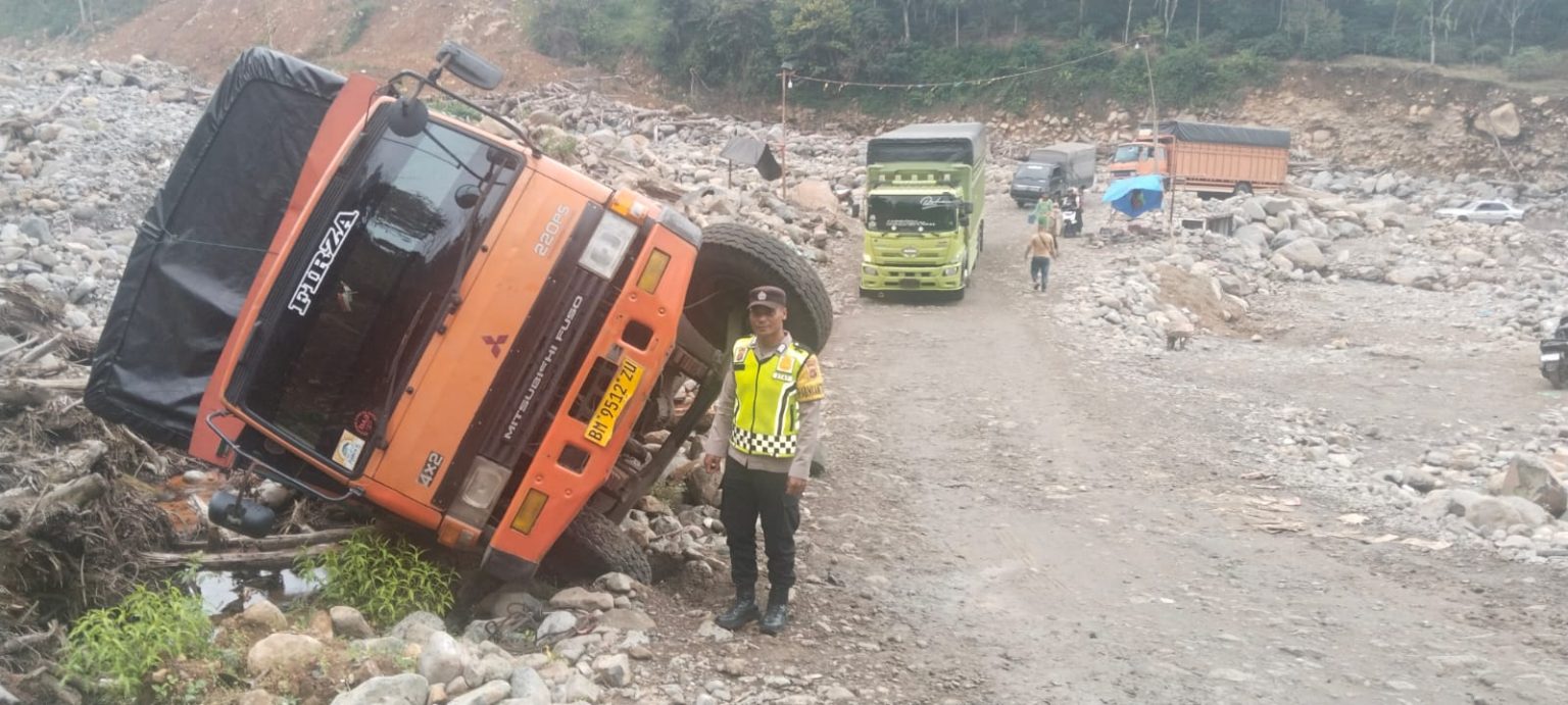 “Setibanya di tanjakan, truk diduga kehilangan traksi akibat jalan licin. Kendaraan mundur ke kanan dan akhirnya terguling,” jelas Kapolsek AKP Suci.