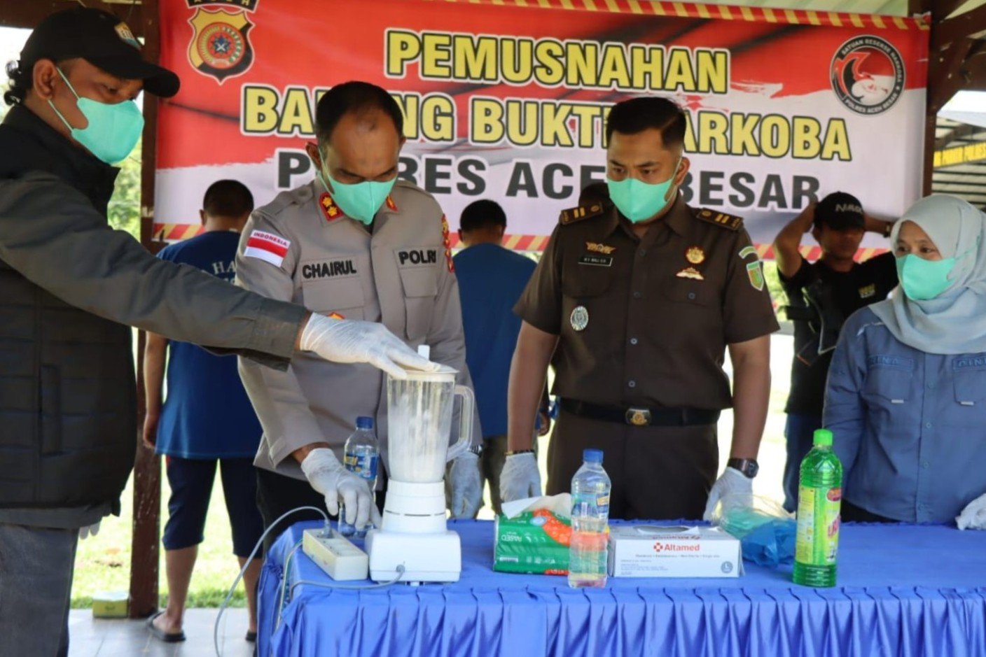 Kegiatan tersebut dipimpin Kapolres Aceh Besar AKBP Chairul Ikhsan, didampingi Kasat Resnarkoba AKP Mukhsin, perwakilan Kejari Aceh Besar, Dinas Kesehatan, serta jajaran Satresnarkoba.