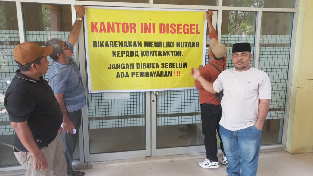 Subulussalam. RU – Puluhan kontraktor menyegel sejumlah kantor dinas teknis di Kota Subulussalam sebagai bentuk protes atas belum dibayarnya paket pekerjaan proyek tahun anggaran 2023 hingga 2024.