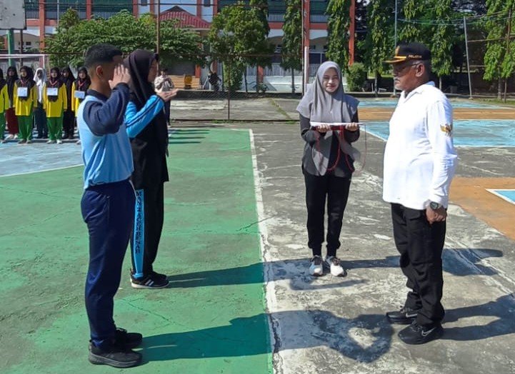 Kaban Kesbangpol Sofian SH, menyerahkan mandat proses seleksi dan pembinaan Paskibra Aceh Besar kepada pelatih, di SMAN 2 Unggul Ali Hasjmy, Kecamatan Indrapuri. Senin 27 April 2026. [Foto Dok : MC Aceh Besar/rahasiaumum.com]
